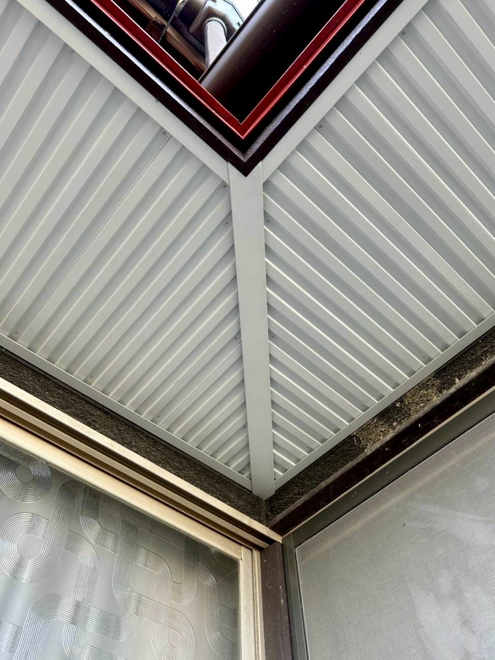 軒裏の天井材が傷んでいたため、一部を角波板に張り替えました。
