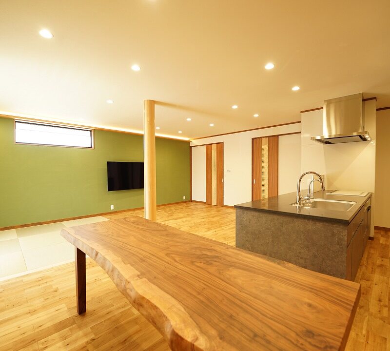 ダイニングテーブルは、味わい深いデザインの無垢一枚板テーブル