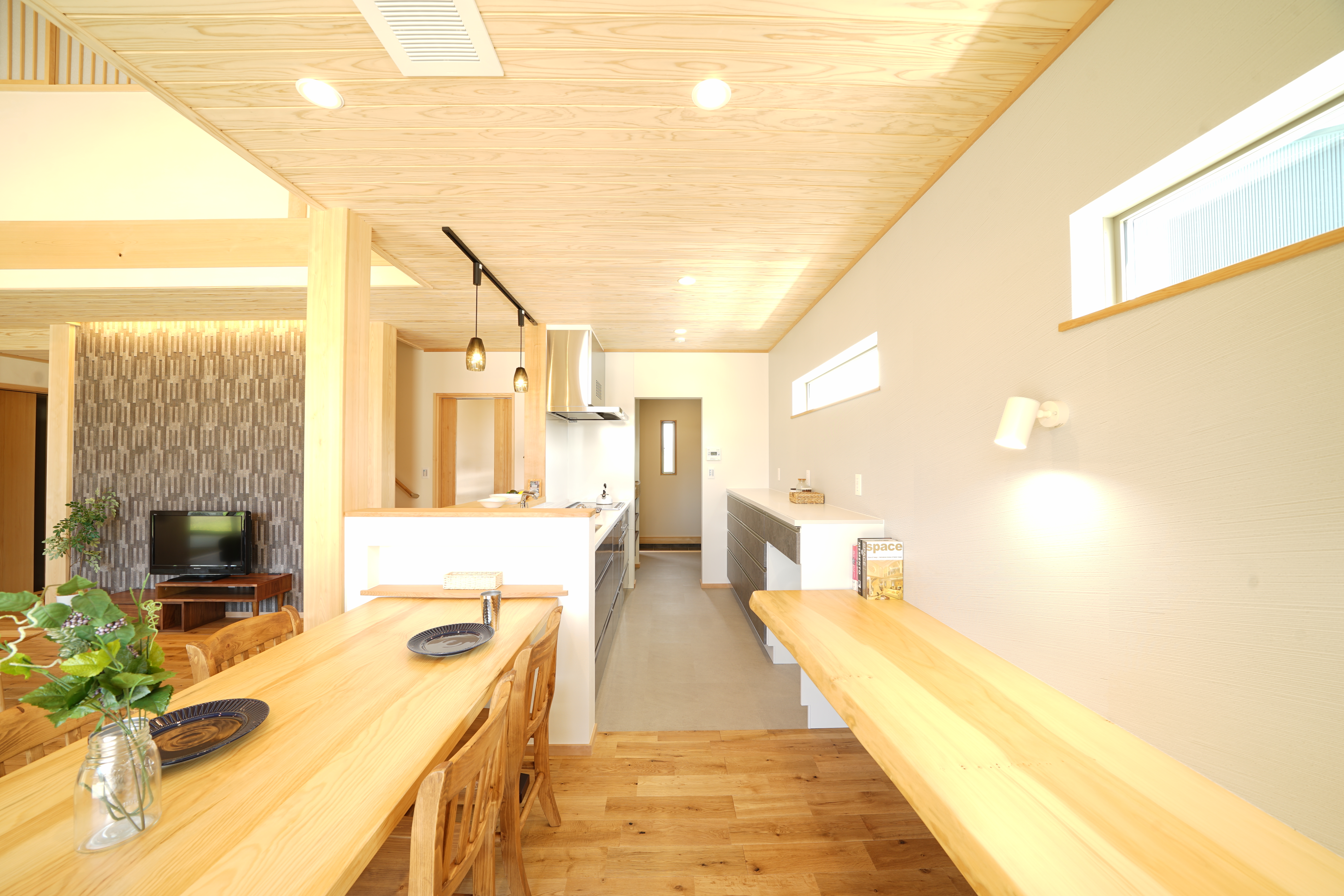 天井材:杉の羽目板天井で空間に温もりと高級感をプラス
