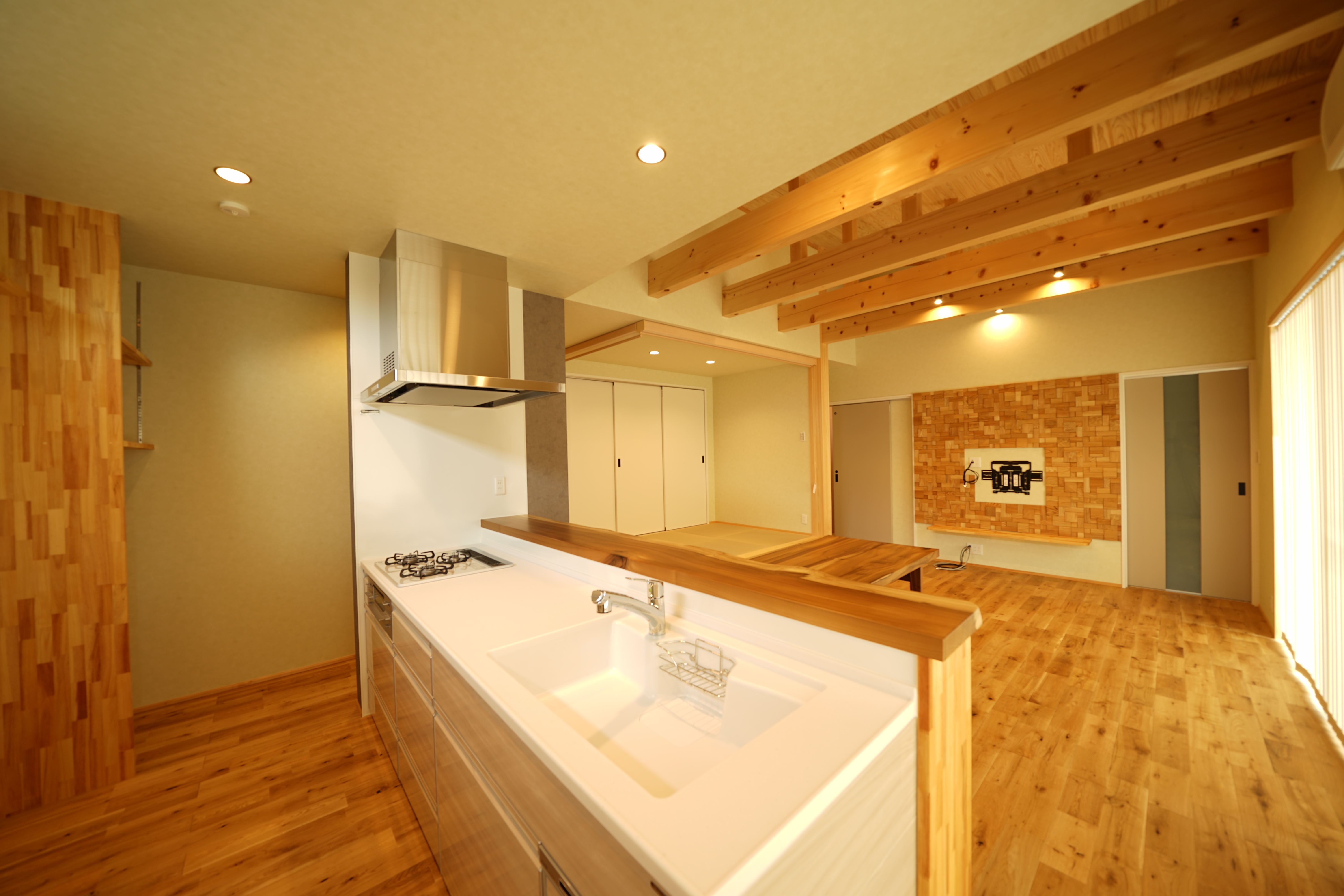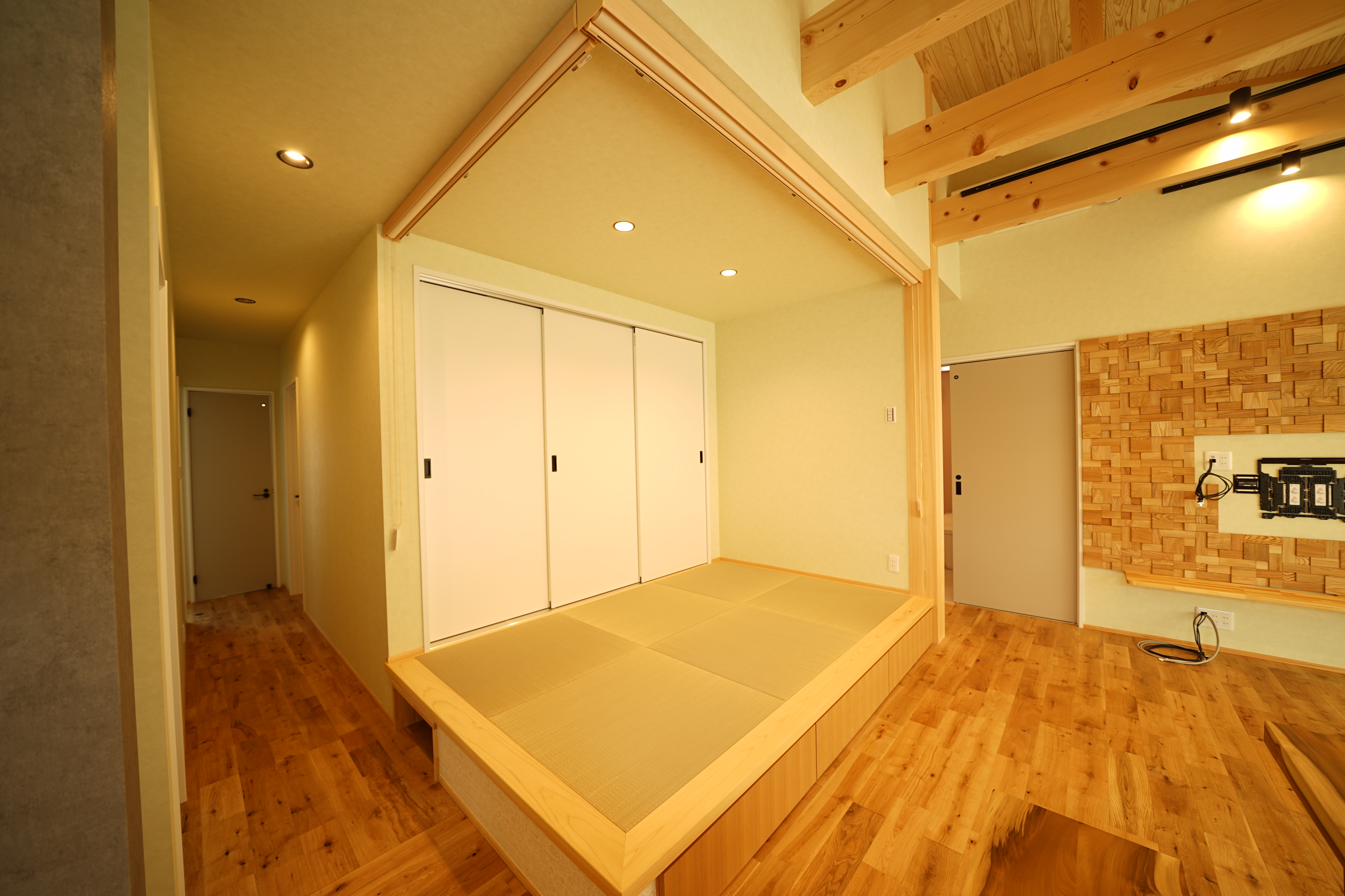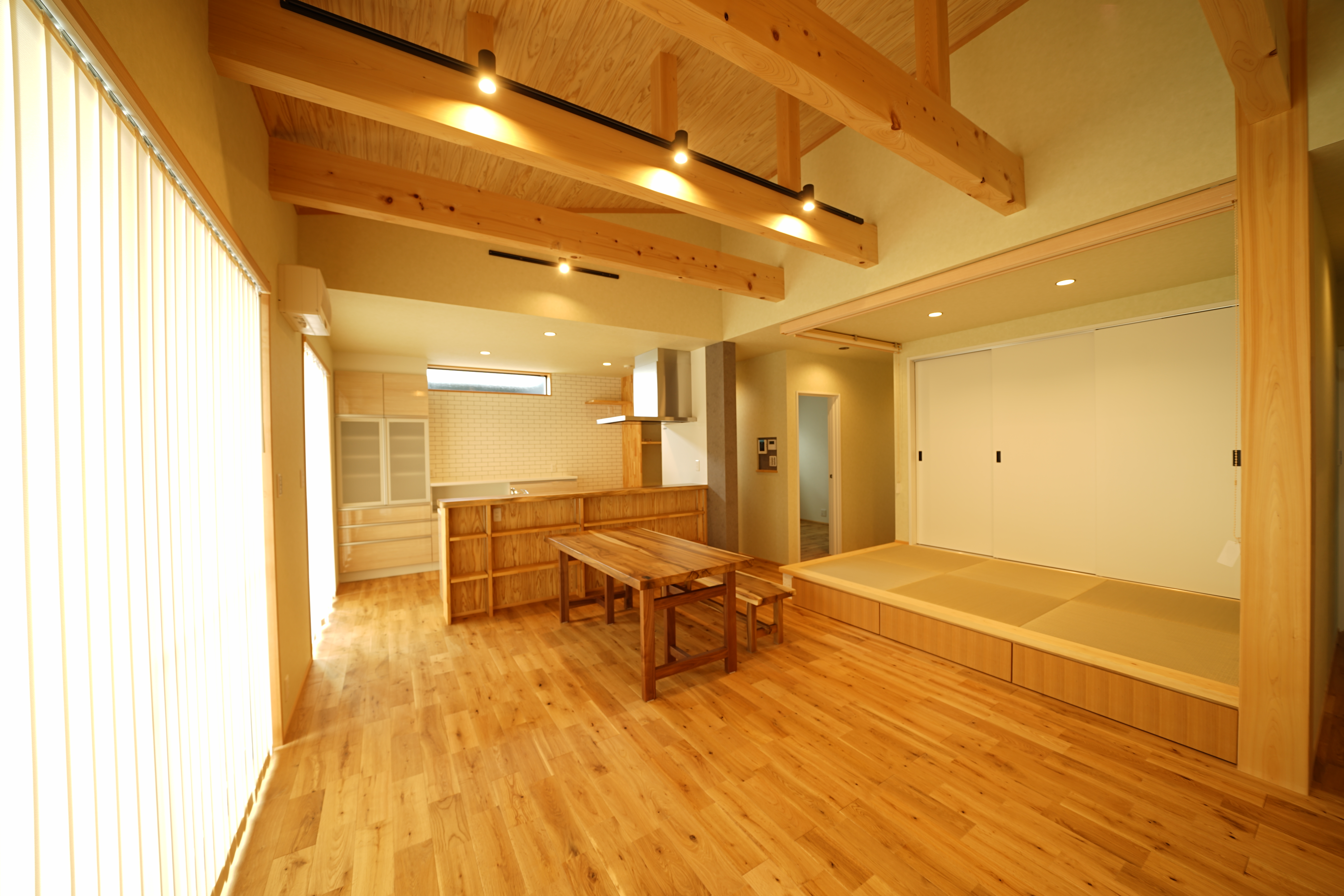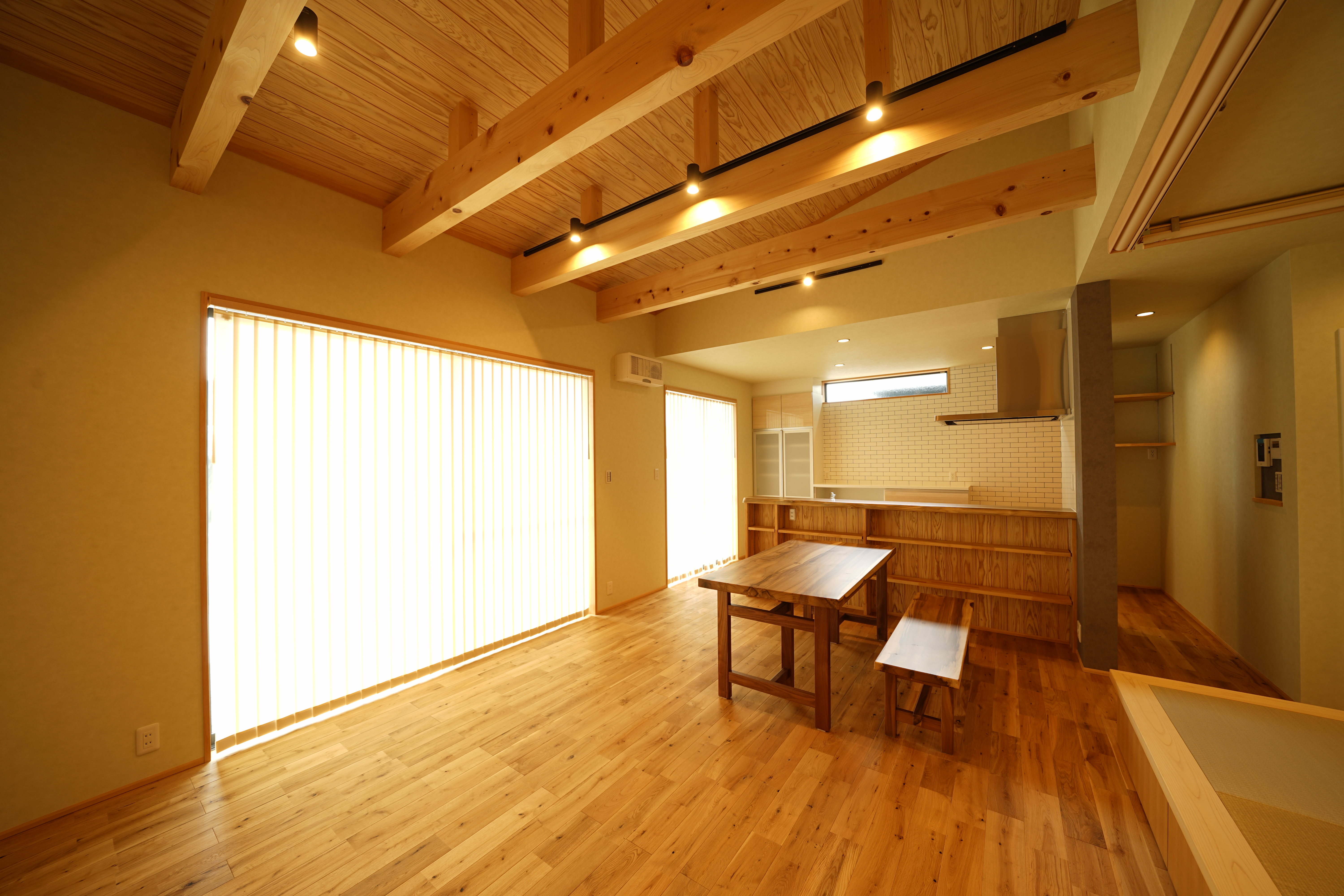 杉の羽目板天井×梁見せ天井で温もりたっぷりな空間に