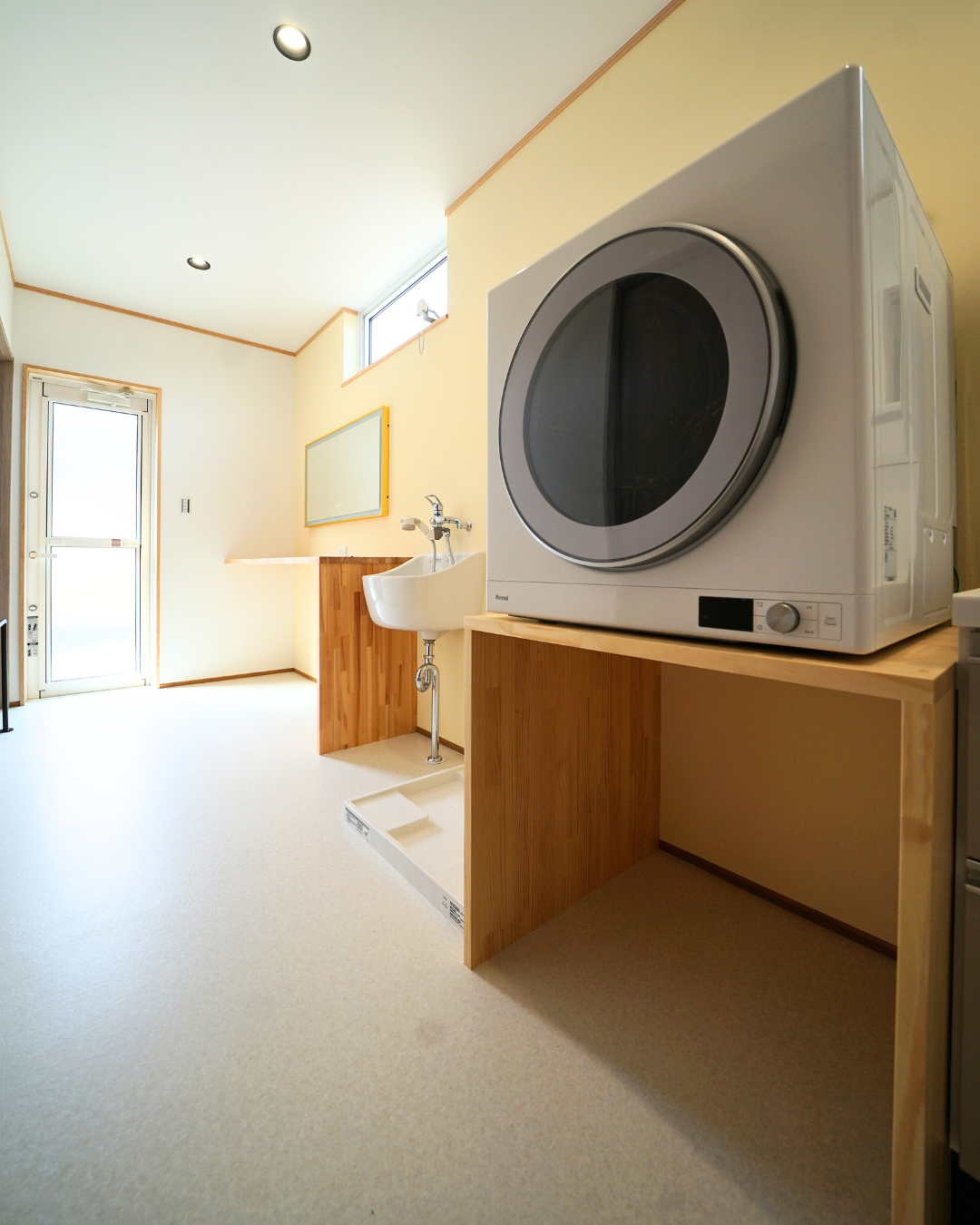 ランドリースペース:乾太くんは、造作架台で洗濯物を出し入れしやすく