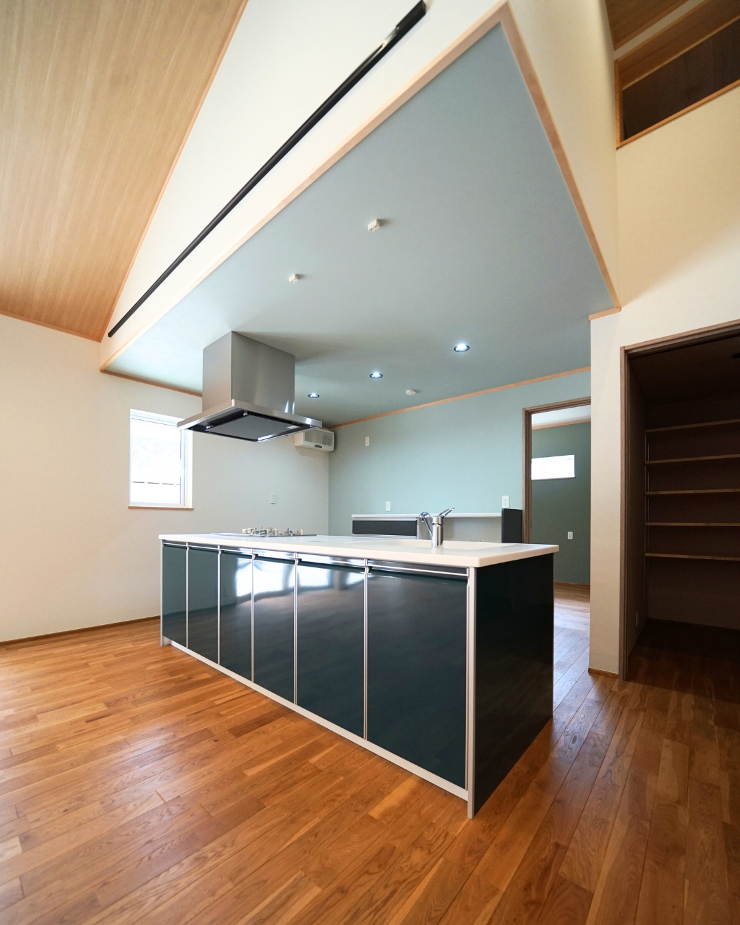 キッチン:タカラスタンダード・グランディア(扉カラー:ブルーグリーン ワークトップ:アクリル人造大理石・ソリッドホワイト)