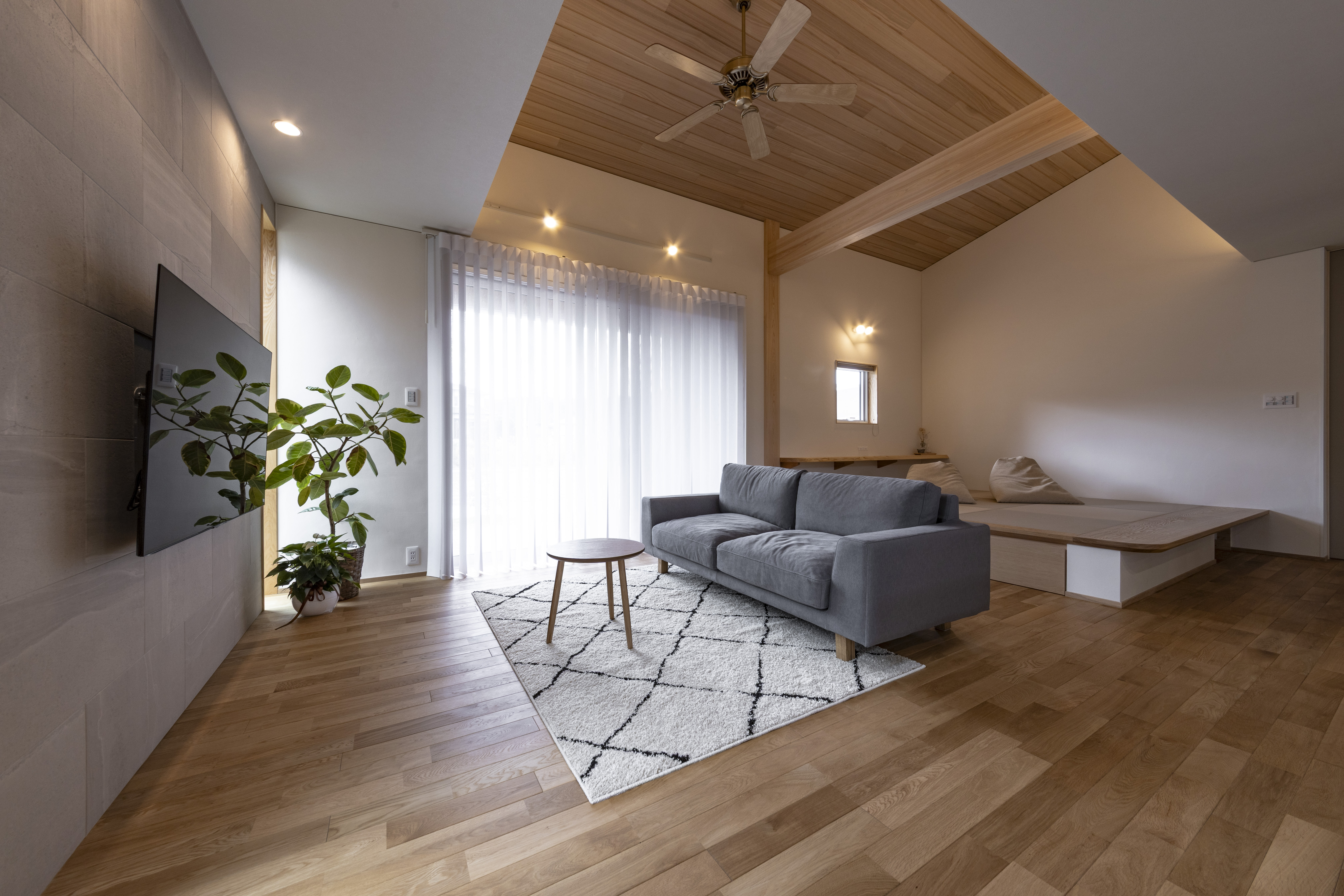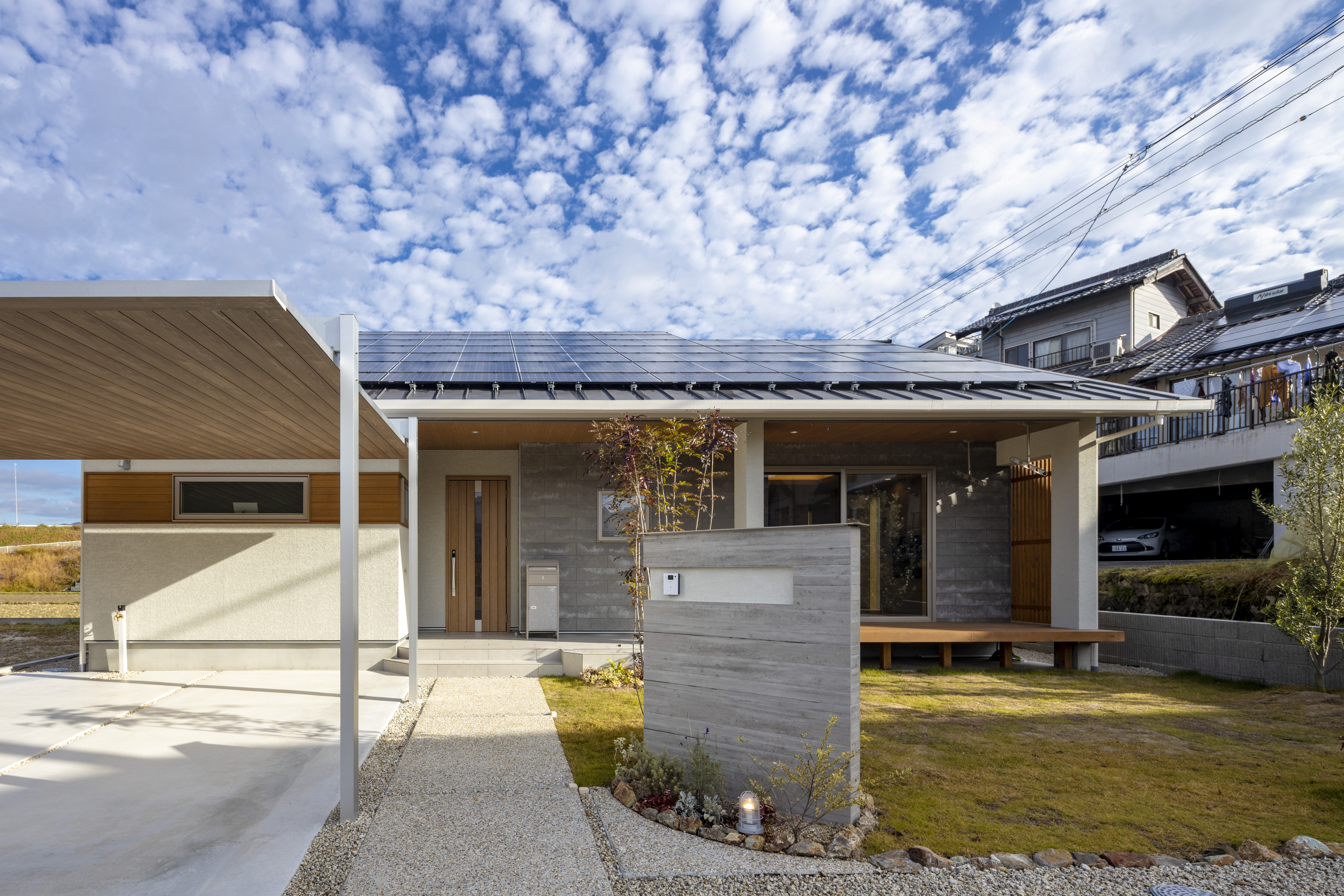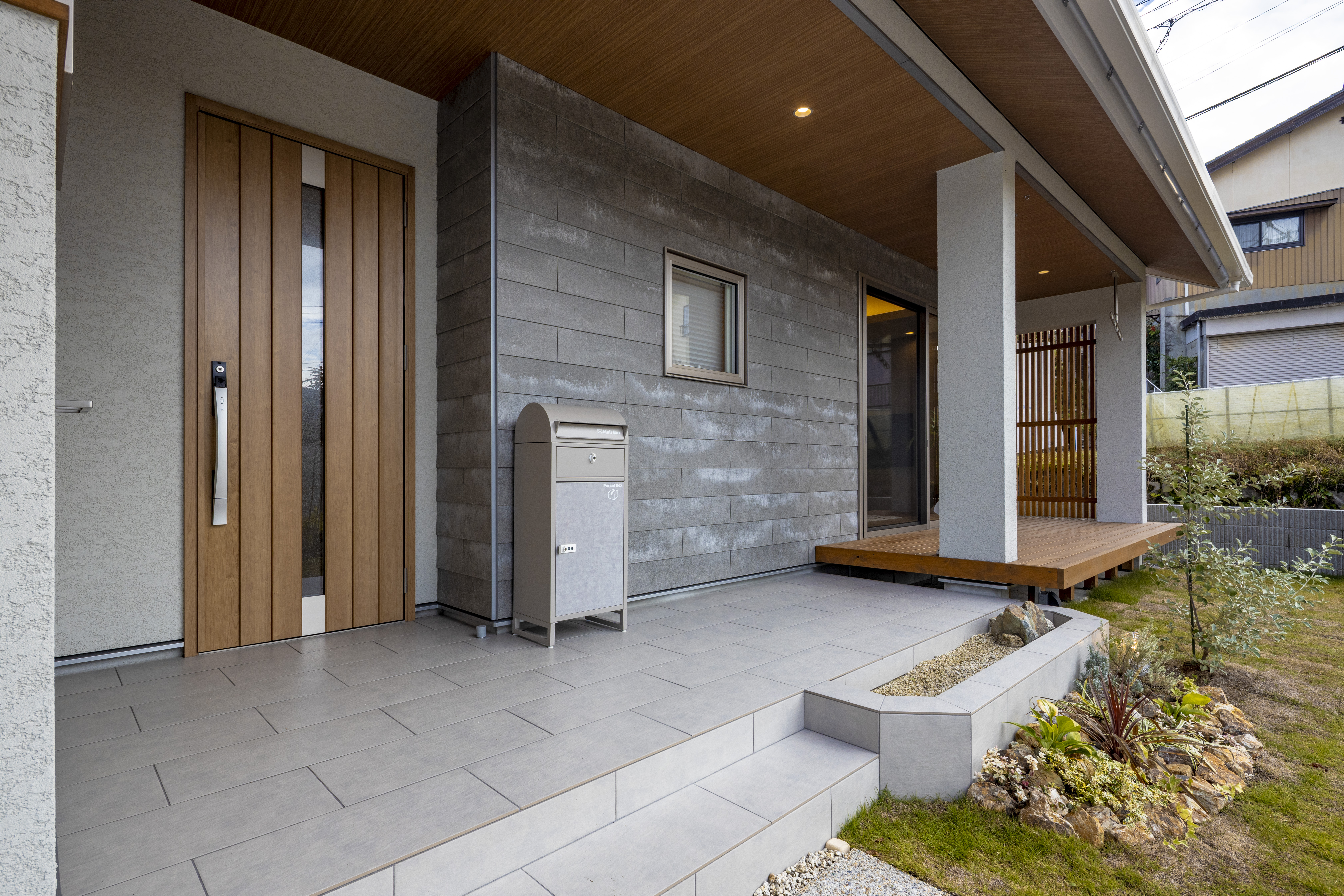 外壁:エスケー化研 ベルアート吹付(トラバーチン:AC-1094) 外壁アクセント:KMEW SOLIDO typeM LAP(セメント)