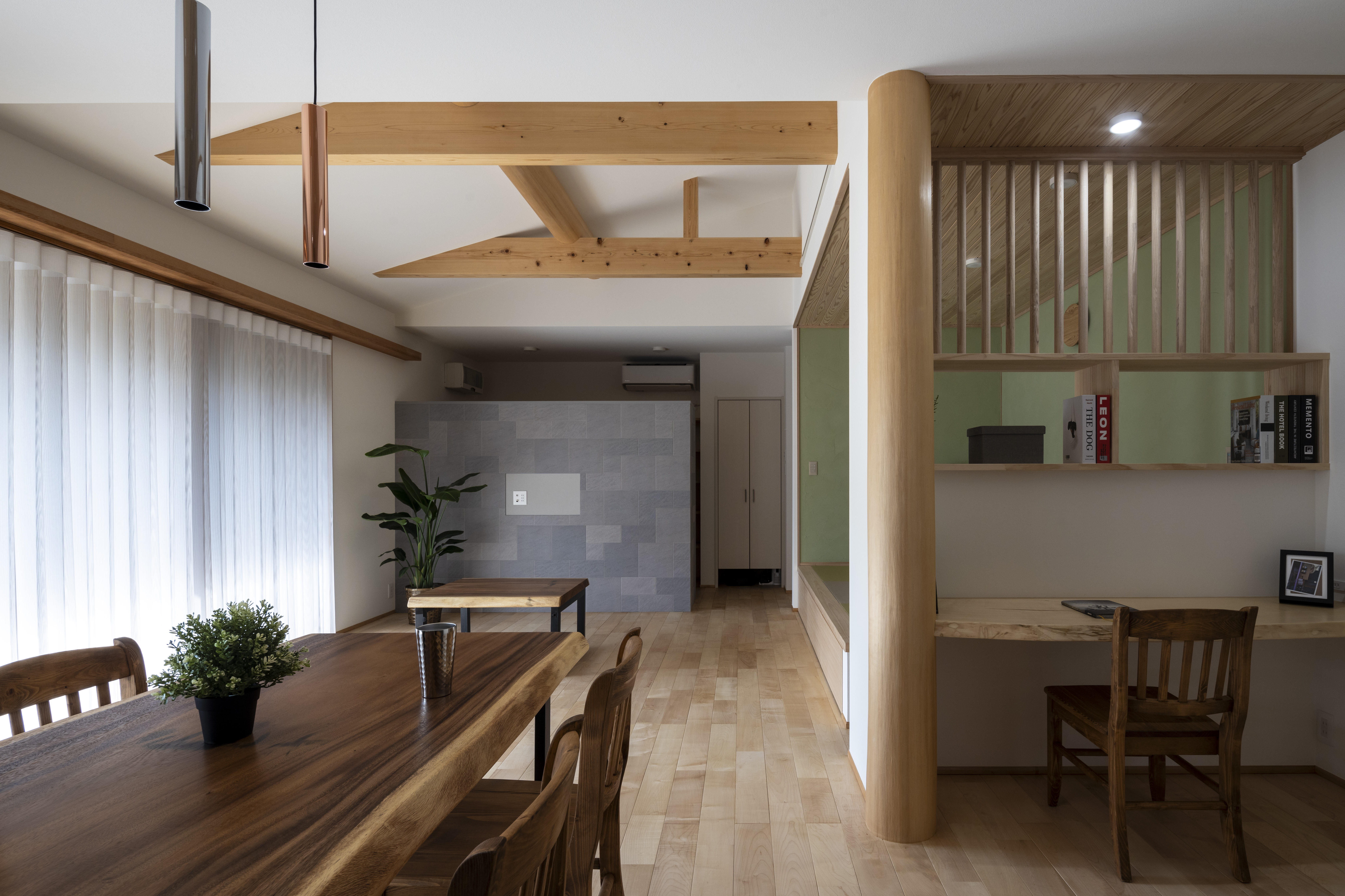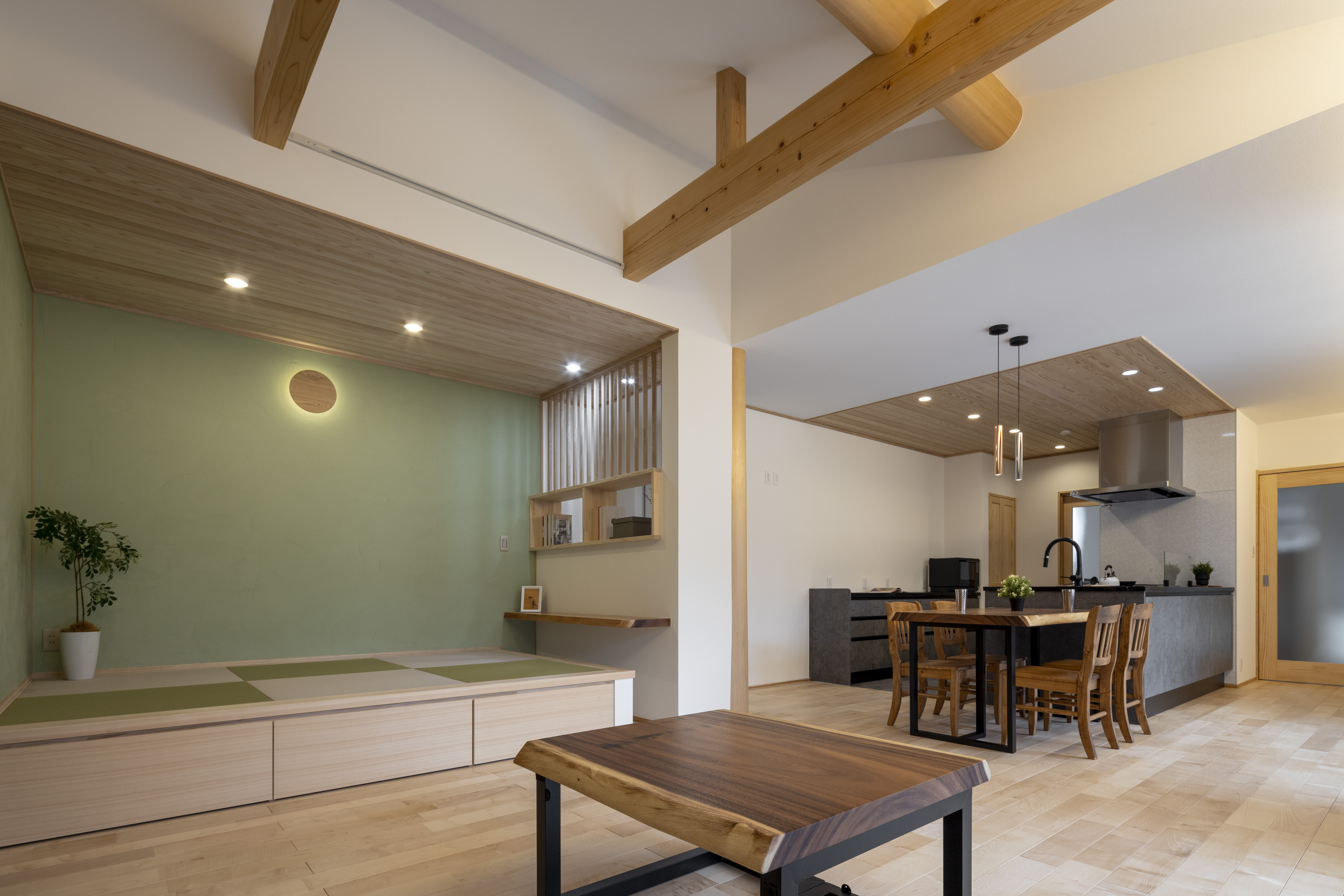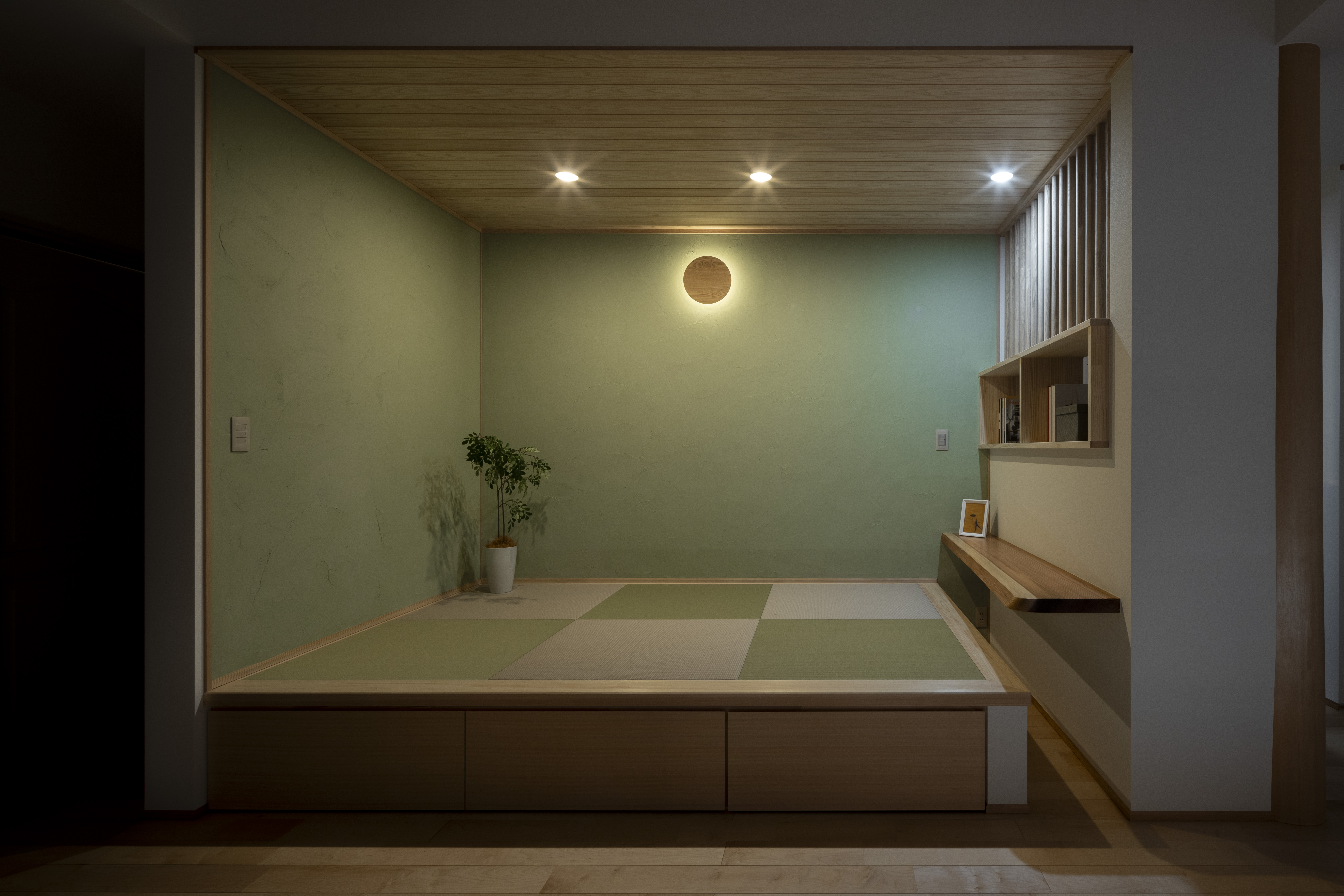 畳スペースの壁材:グリーンをミックスしたヒノキ漆喰壁で趣きのある空間に