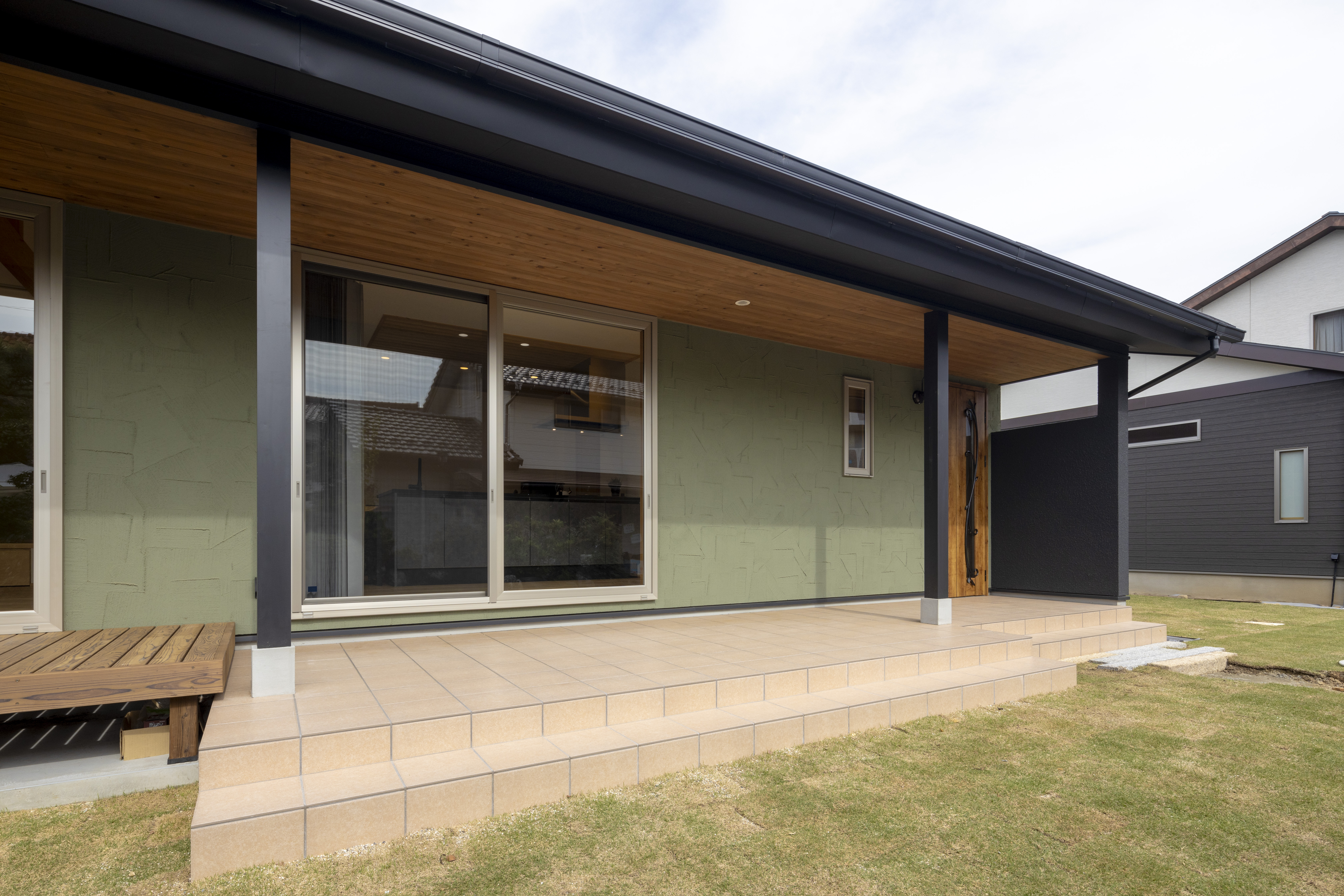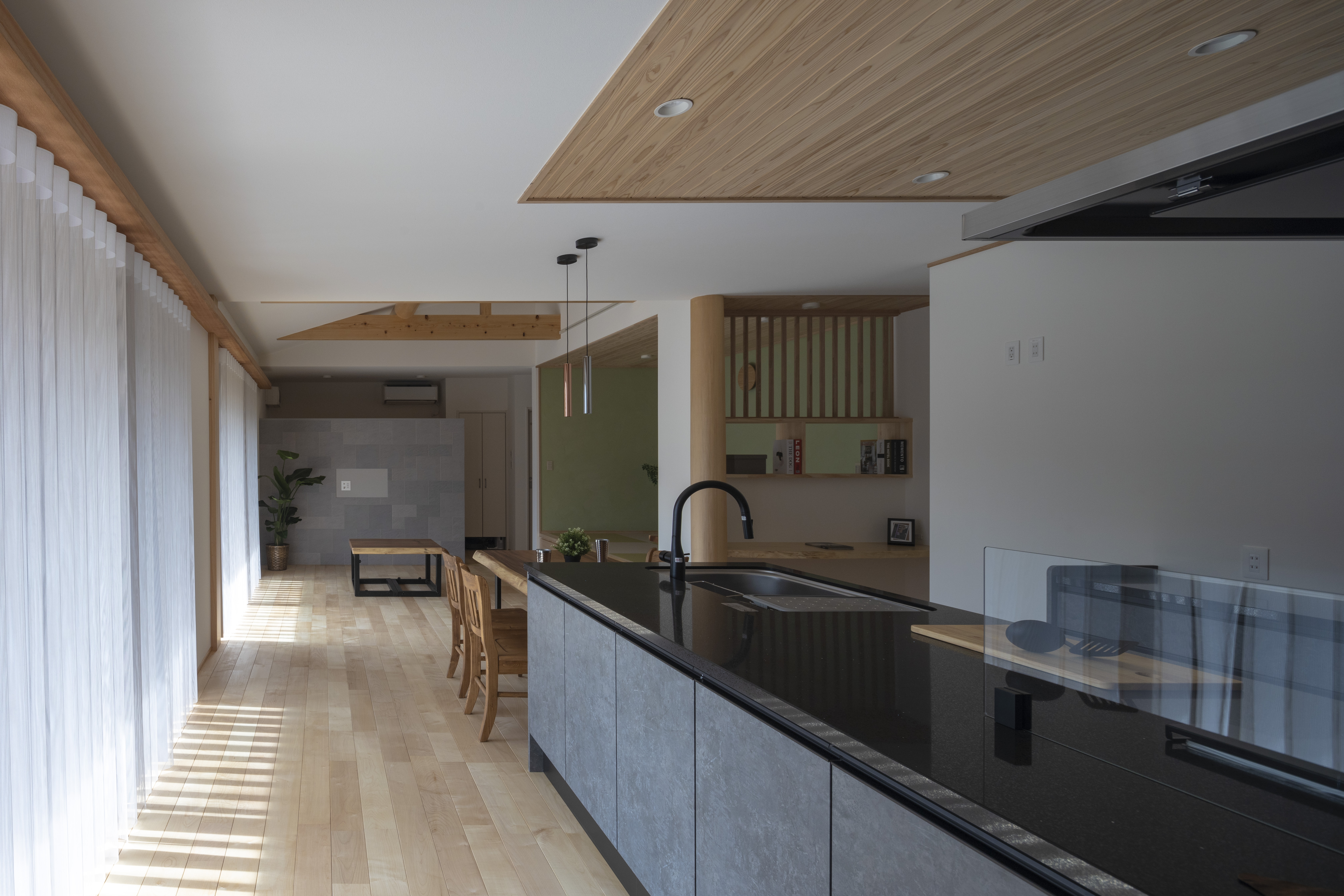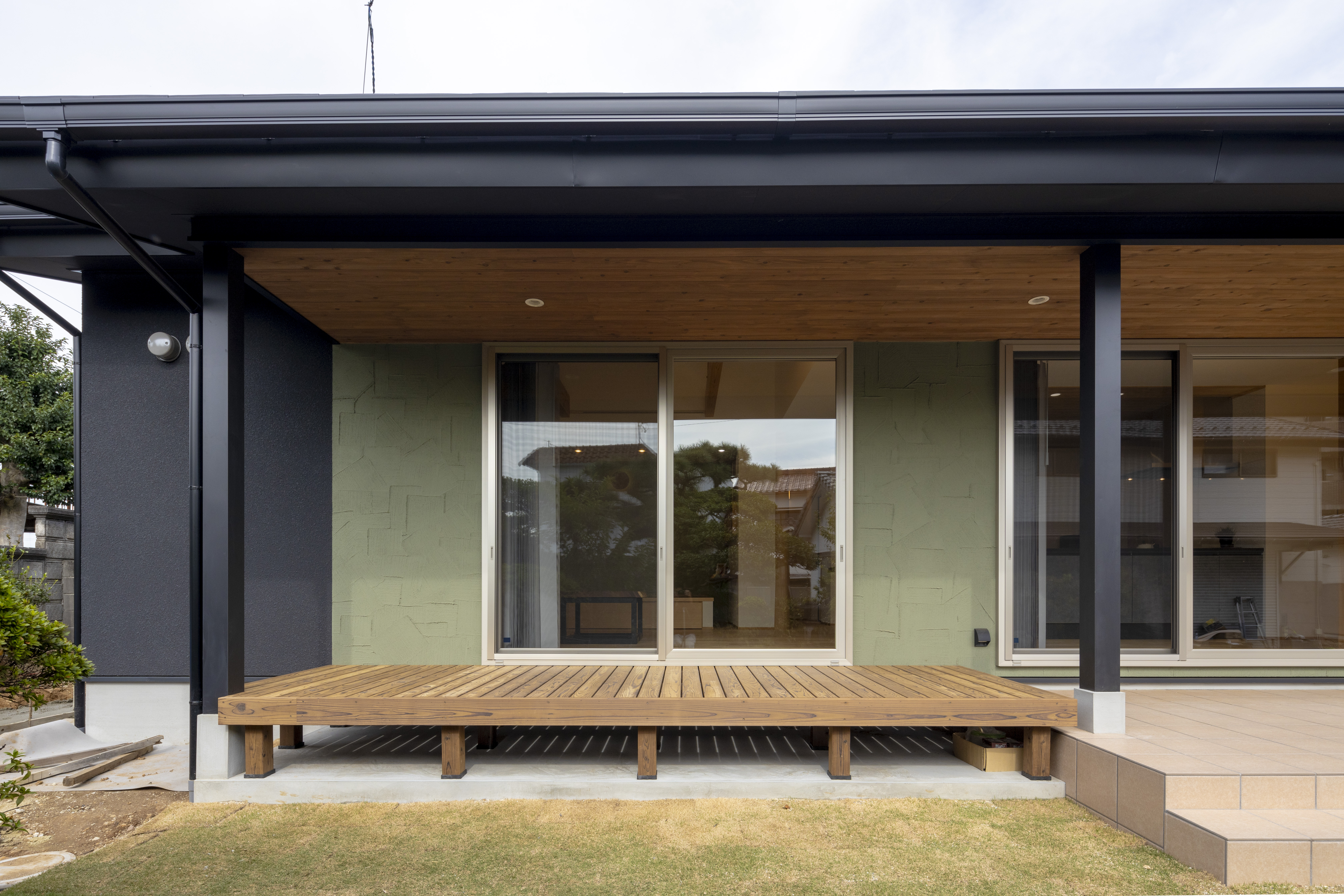 畳スペースの壁材:グリーンをミックスしたヒノキ漆喰壁で趣きのある空間に