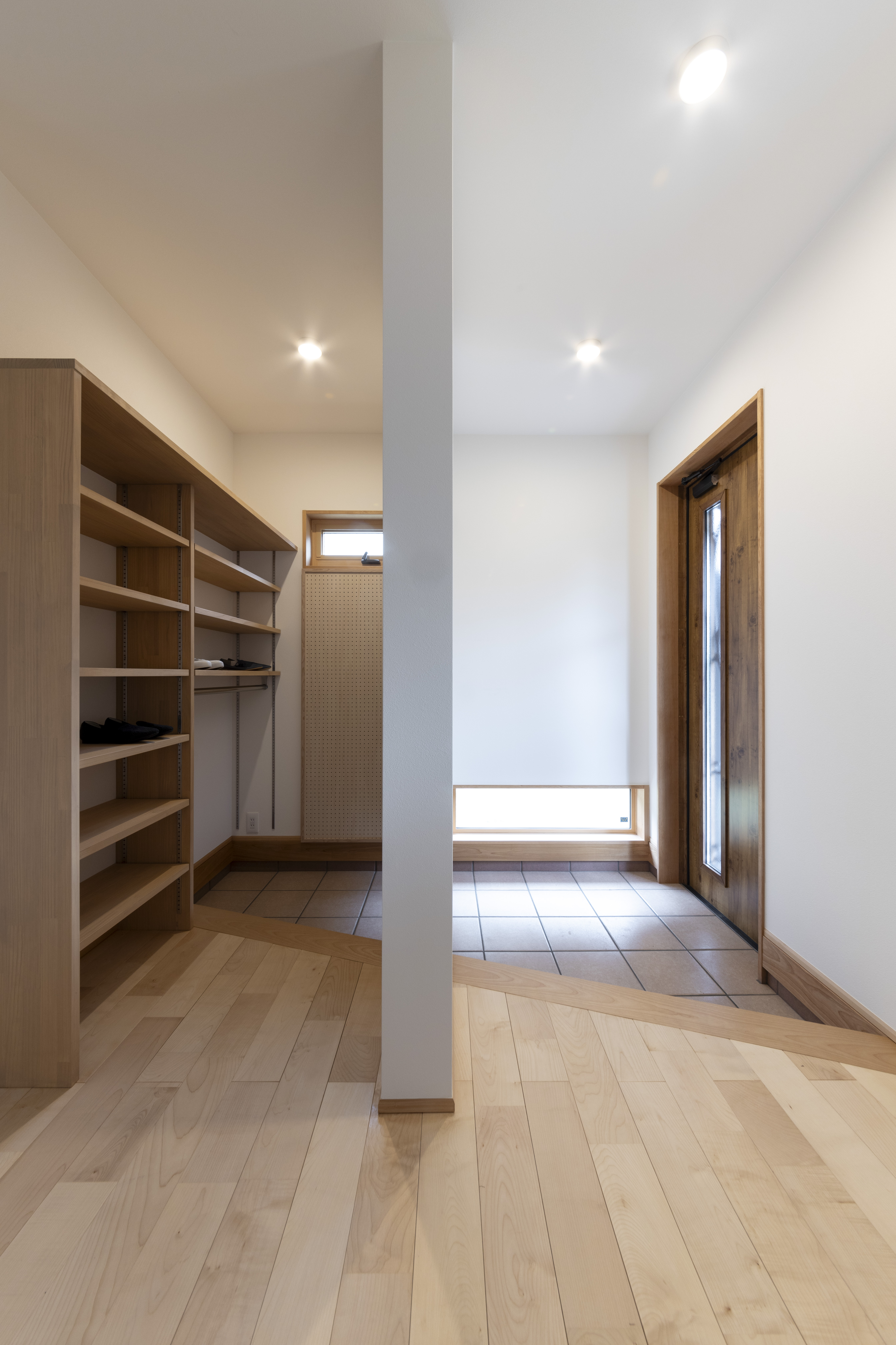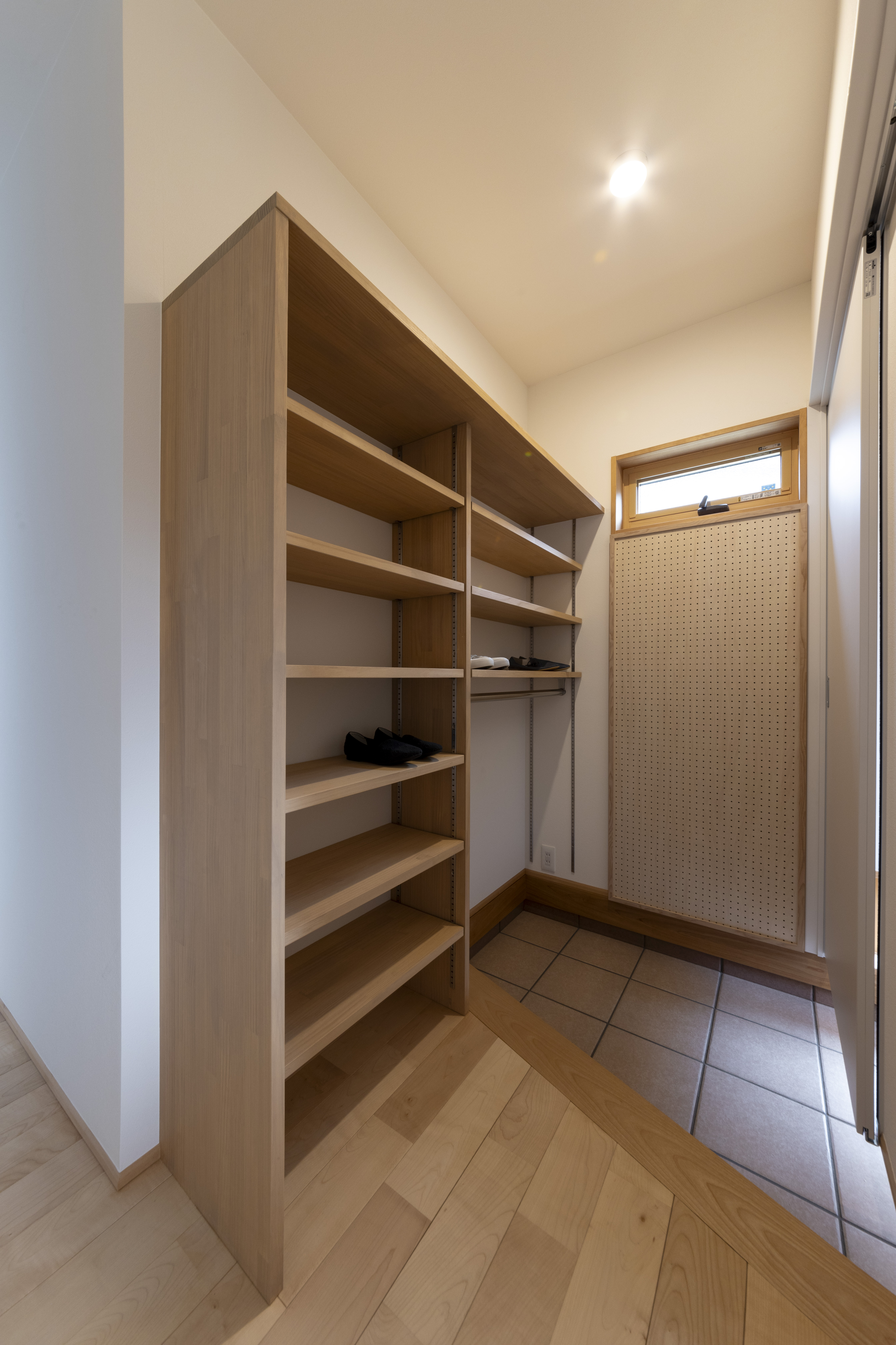 シューズクローク:帽子やバッグ、ファッション小物をお洒落に収納できる有効ボードを設置
