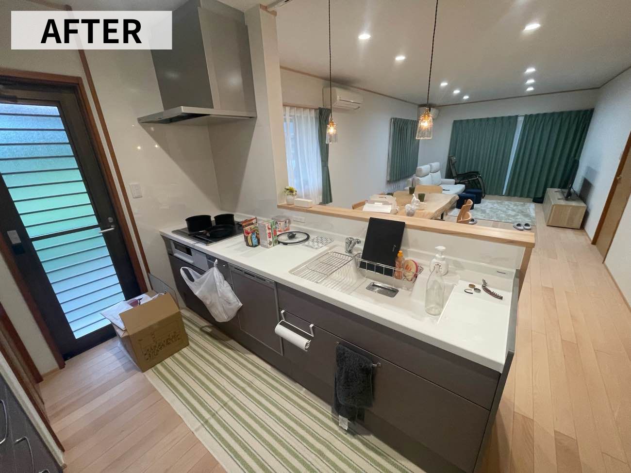 キッチンカウンターの形を見直し、吊戸棚をなくすことで明るく、開放感たっぷりな空間に!